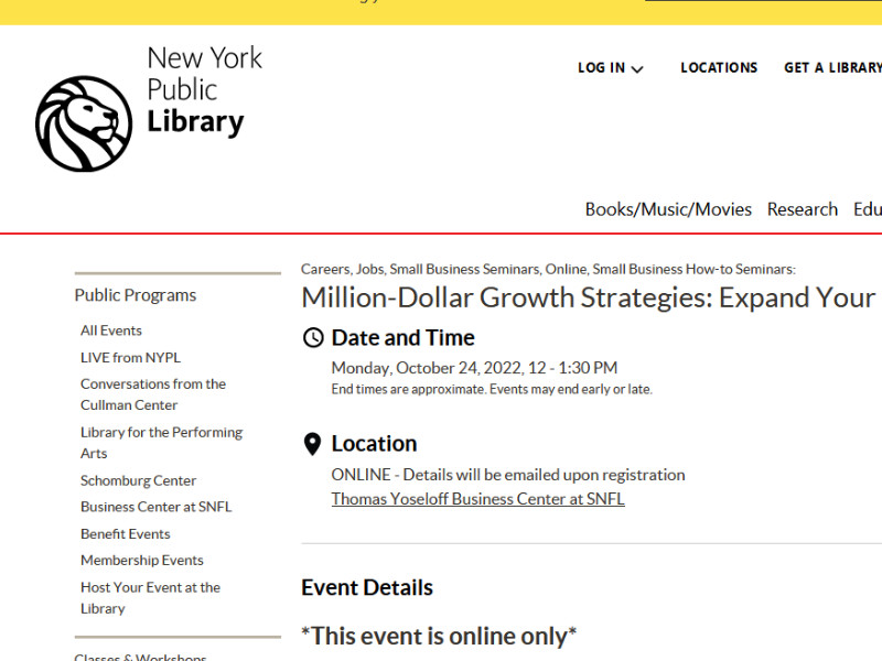 If you are interested in attending this event, it will be held online on Mon 24th October from 12pm to 1:30pm. You can register to attend the event here: https://www.nypl.org/events/programs/2022/10/24/million-dollar-growth-strategies-expand-your-business-mindset